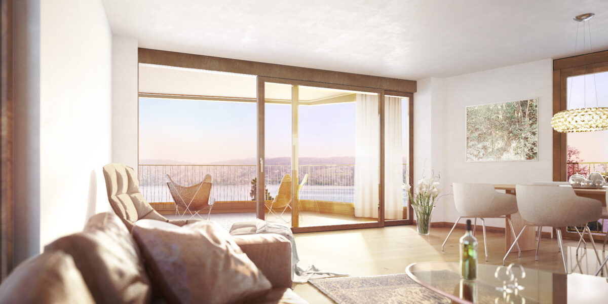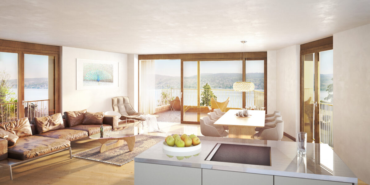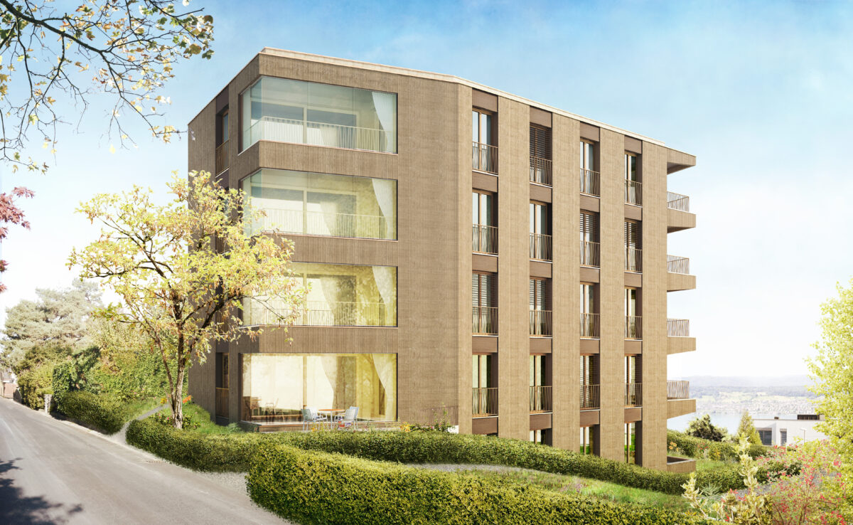 Das Haus „Zimbergen“ orientiert sich der Sonne entgegen zum See. Der Luxus von nur einer Wohnung mit 4,5 oder 5,5 Zimmern pro Geschoss garantiert Ruhe und Privatsphäre. Der offene Wohnraum wird durch einen grosszügigen, übertiefen Balkon zum See hin erweitert. Die Attikawohnung verfügt über eine grosszügige Dachterrasse mit einer einmaligen Panoramasicht von der Stadt Zürich über den Pfannenstiel bis zu den Alpen.